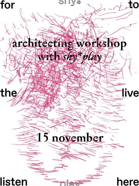 Flyer with a white background and pink scribble-like lines in the center. Black text reads “architecting workshop with shy*play, 15 November,” surrounded by smaller words: “for,” “to,” “the,” “live,” “listen,” “play,” and “here.”