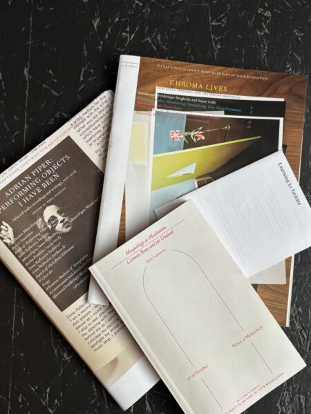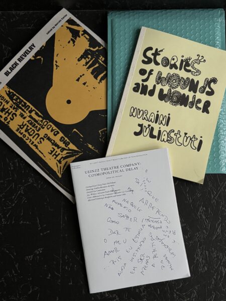 The Pack Experiments in Story-telling and World-making offers different experimentations with story-telling, worlding and book-making. It combines Derrais Carter’s Black Revelry: In Honor of ‘The Sugar Shack’, a book that is also an LP record and a series of short texts to be savoured while sipping cocktails; Nuraini Juliastuti’s Stories of Wounds and Wonder, a transgenerational book with different levels of readability narrating cross-species practices of survival across the Indonesian archipelago; and Peter Pál Pelbart’s Ueinzz Theatre Company: Cosmopolitical Delay, which unfolds the theatre group’s proposition of performance-making “for all those who feel the world around them is crumbling” through personal recollections, script fragments, and philosophical reflections.