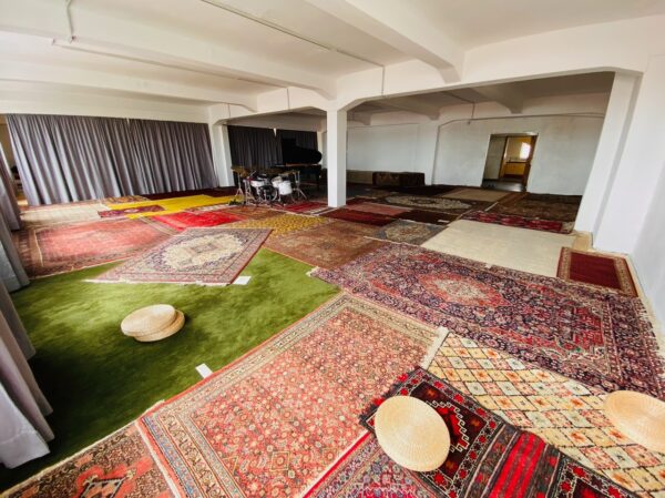 A very large room is filled with a multitude of carpets of different colours and styles. Spread around are also straw cushions and white paper cards. The space has white concrete ceiling with visible beams crossing it. Two arches descend on the ground, gently dividing the room. Two of the four walls are covered with long greyish/purple curtains. In the corner opposite the camera a drum set and a grand piano are visible.